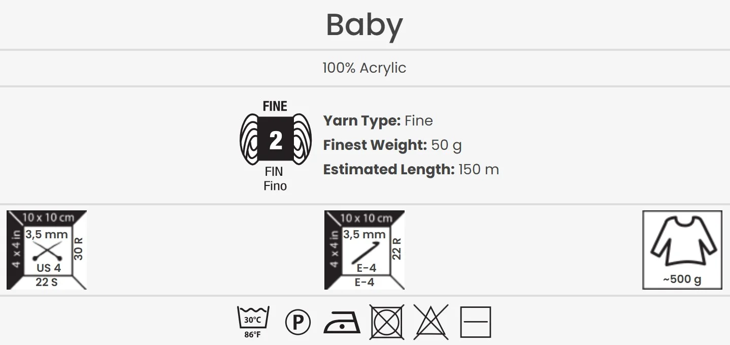Mit YarnArt Baby umhüllen Sie die Kleinsten mit Zärtlichkeit und Komfort. Dieses Garn aus 100 % speziell verarbeitetem Polyacryl ist federleicht und besonders hautfreundlich – perfekt geeignet für empfindliche Babyhaut. Die feine Stärke und die beeindruckende Lauflänge von 150 m auf nur 50 g machen es zu einer ergiebigen Wahl für Baby- und Kinderprojekte.